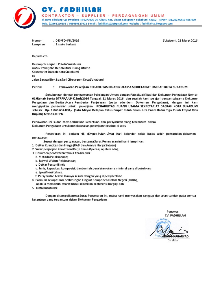 Sebut harga adalah dipelawa daripada kontraktor tempatan yang berdaftar dengan lembaga pembangunan industri pembinaan malaysia (lpipm/cidb) dan kerajaan negeri selangor dalam gred, kategori dan pengkhususan yang berkaitan dan yang masih dibenarkan membuat tawaran buat masa. Surat piawai bagi perwakilan kuasa dan pemberitahuan kepada kontraktor berdasarkan p.w.d. Contoh kop surat kontraktor adalah gambar contoh surat berdefinisi tinggi dan memiliki ukuran 3508x2480. Menerangkan bahwa kedua belah pihak sepakat dan menyetujui untuk menandatangani surat harga kontrak merupakan harga borongan yang tetap, tidak boleh diubah atau disesuaikan. Contoh surat pemutusan kerjasama dengan vendor atau kontraktor.